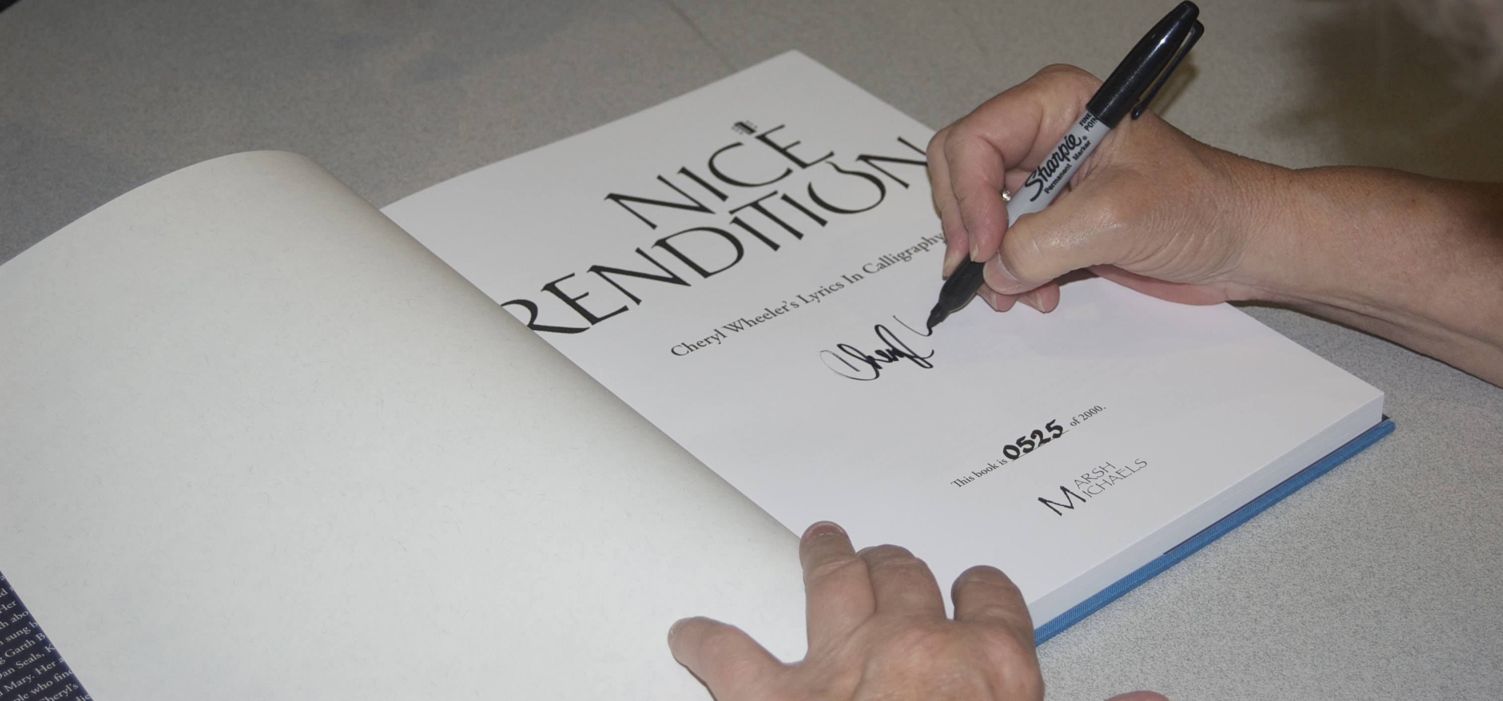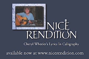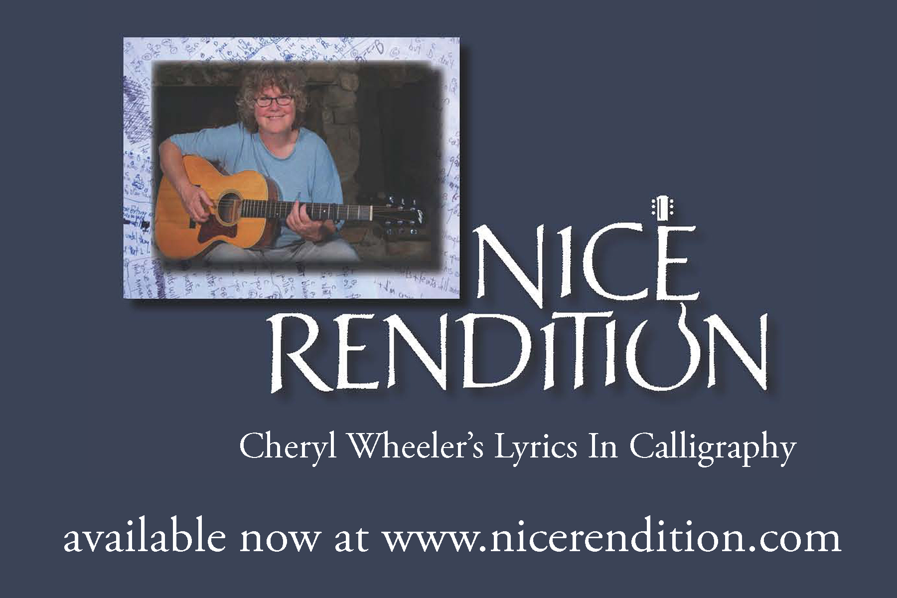 Nice Rendition: Cheryl Wheeler’s Lyrics in Calligraphy is available for sale at nicerendition.com and at most of Cheryl’s New England shows. Some of the original art pieces will continue to be exhibited around the US.