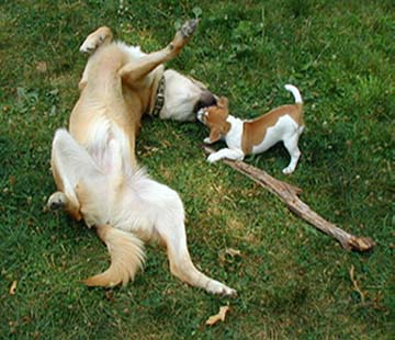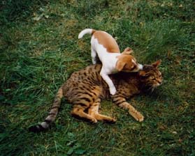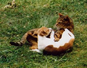 Here is a picture of Kitty and Lou playing. Kitty is the small dog, and Lou is the large cat. Cheryl's song Meow is about Lou.